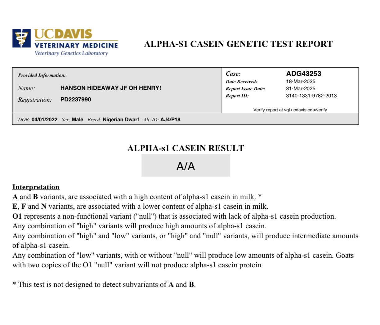 Alpha s1 casein: A/A