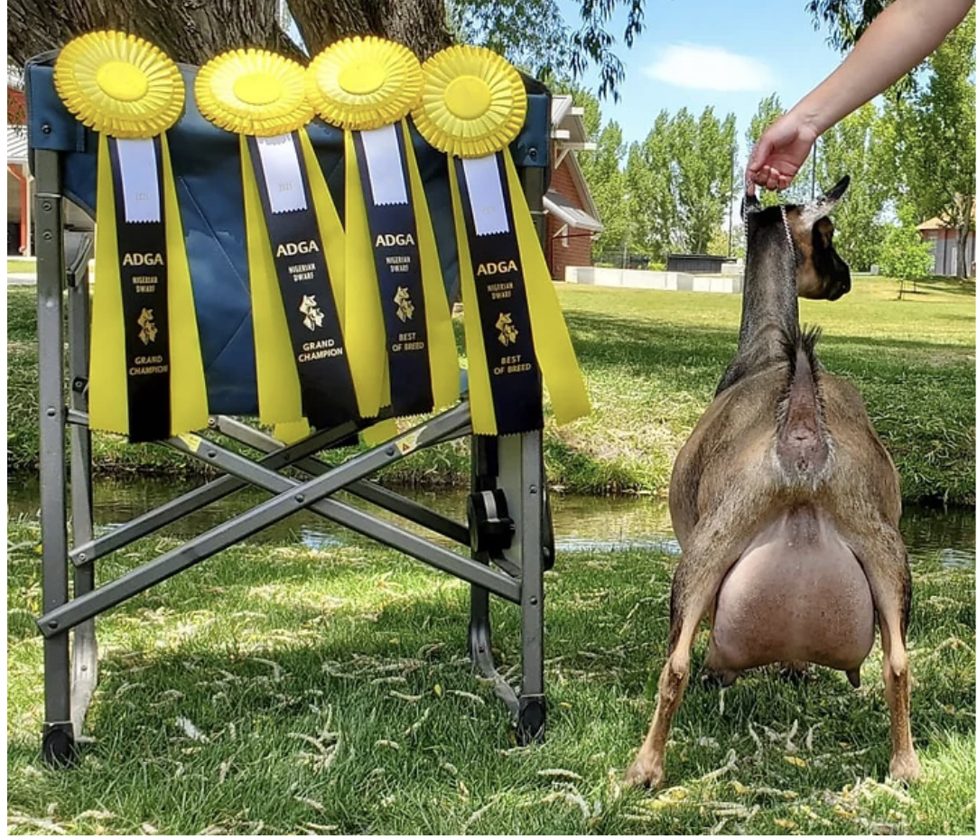 Henry is our first buckling that we imported. Henry's first kids were born spring of 2023. We are hoping to improve rump width, overall general appearance and butterfat in our herd. Photos of dam are used with permission from Hanson's Hideaway Farm. See Dam's info below. Henry is half sibling (on dam's side) to the ADGA National Champion 2023.