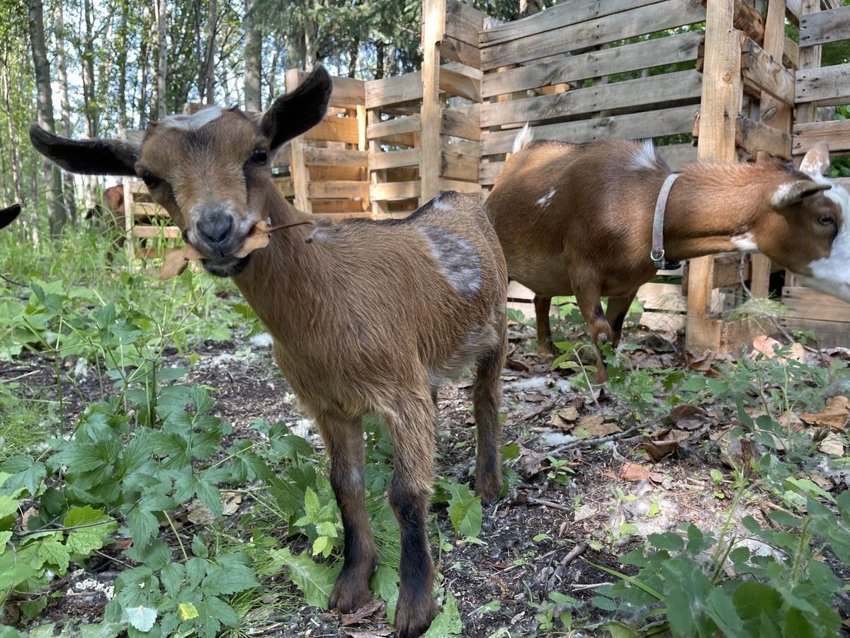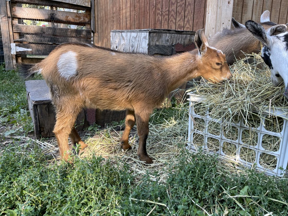 Gidget is the only doe that we got from her dam, Gigi. Gidget is just like her mom- quiet, kooky and super friendly. We had not planned on breeding Gidget the first go around as she was on the small side. We plan to wait to re-breed her to kid at 3-00.